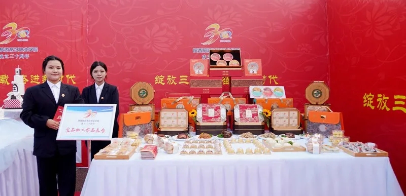 月饼,又称月团、丰收饼、团圆饼等,是中国的传统美食之一。俗话说“钟记饼香,万家共尝”,月饼象征着大团圆,人们把它当作节日食品,用它祭月、赠送亲友。月饼的营养价值较高,含丰富的糖、脂肪、蛋白质、无机盐和维生素等。我们这里展示的月饼主要有广式,台式,法式月饼等,这个是印有我校30年印记的大饼月饼。以及印有我校30年印记的特制黄金大饼,不仅展示学校的辉煌历史和未来发展,还预祝此次校庆圆满成功。总的来说,月饼不仅是美味的食品,更是传递亲情和祝福的载体,体现了中国人对团圆和美好的追求。