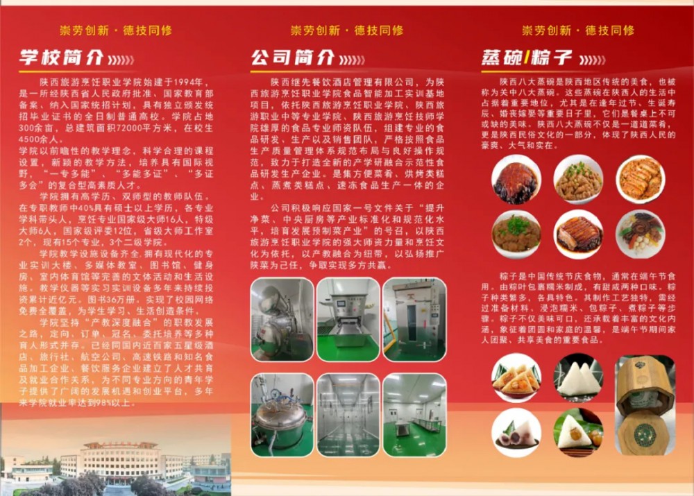 我们陕西美食十分有特色,而陕西八大碗,则充分展现了关中人的豪爽、大气、实在。陕西八大碗,是指八种不同的菜肴,这些菜肴通常都是蒸制的,陕西八大碗包括金枣糟肉,黄焖鸡、小酥肉、粉蒸肉,梅菜扣肉、夹沙肉,八宝饭等,其中金枣糟肉多次作为参赛作品,在国赛中获取金奖。我们的八大碗通过传统工艺与现代化生产结合,最大限度保留其营养,达到了零添加保鲜的效果。