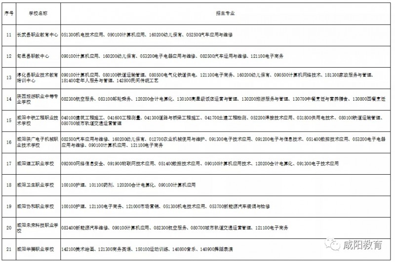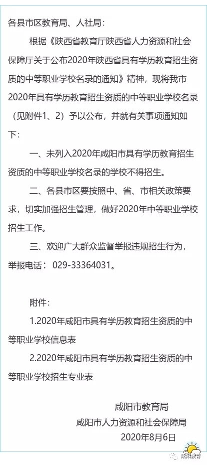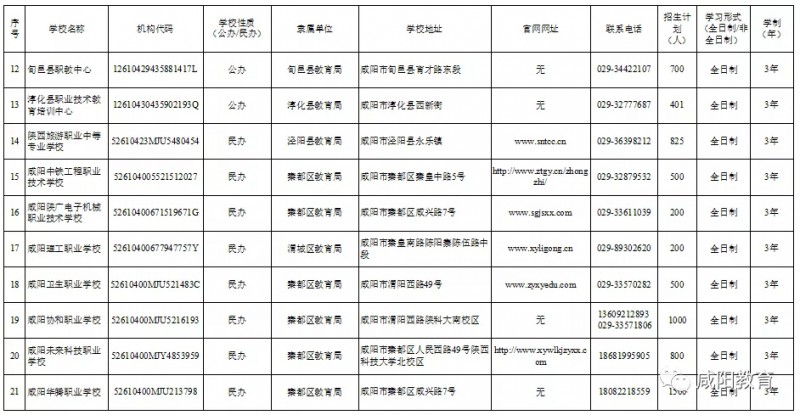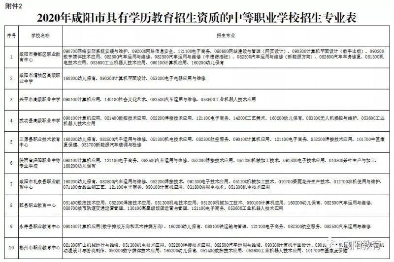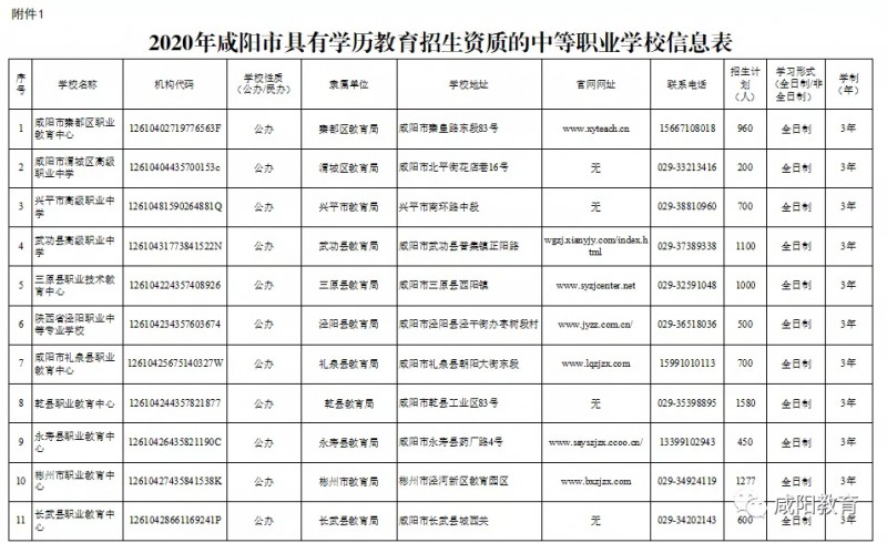 咸阳市教育局 咸阳市人力资源和社会保障局联合发文公布2020年具有学历教育招生资质的中等职业学校名录