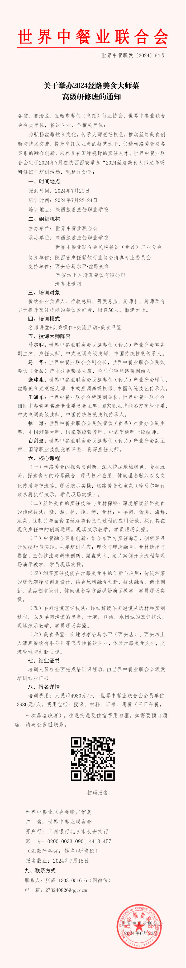关于举办2024丝路美食大师菜高级研修班的通知