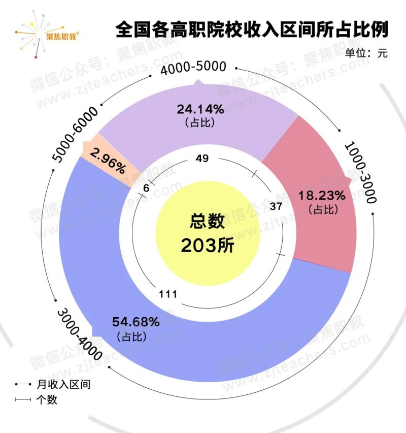 通过对以上数据的整理,聚焦职教将毕业生月收入按区间共分成4部分。其中,月收入在3000-4000元的院校占比最多,为54.68%,共111所院校;月收入在5000-6000元的院校有6所,占比最少,为2.96%。4000-5000元的院校有49所,1000-3000元的院校有37所,两个区间一共占比42.37%。可以看出,大部分高职院校毕业生的月收入都在3000-4000元左右。
