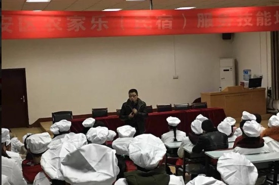 长安区截止2017年底,己发展“农家乐”1600余户,“农家乐”是长安区五大支柱产业之一,现有的农家乐经营模式滞后,经营理念,经营方式己远远落伍。为改进这一局面。中心与学院共谋大计,精心设置课程,区上拔专款专用进行产业调整,“做強农家乐”。在区扬庄街道选调39人,滦镇街道选调65人,由政府买单,免费为“农家乐”经营业主进行培训,走进大学课堂,接受专业知识学习。系统学习了“农家乐”十互联网十教育十名片的知识,了解“民宿”的发展历史,掌握“农家乐”经营之道——独家独院“吃、住、游、玩、购”一体化新理念。