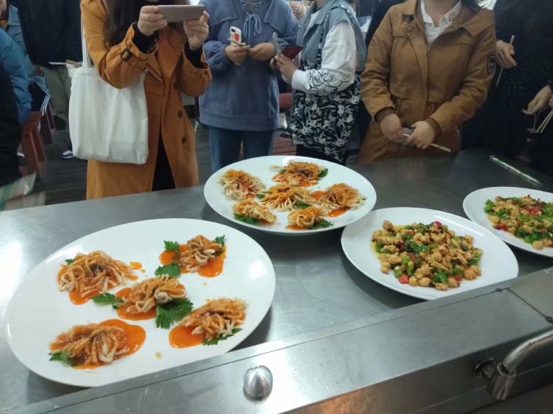 下午四点三十分,应陕西中医药大学辛宝教授的提议,bw必威西汉姆联官方网站赵军山大师现场为该校师生展示了精美的厨艺,一道菜是辣子鸡丁,一道菜为菊花鱼,经过烹饪工艺平刀、直刀、花刀、挂糊、上酱、过油等技法,使这两道菜尽显工艺之美。辣子鸡丁口味留香,菊花鱼如秋菊绽放,意境之美巧夺天工。使现场师生惊叹不已。