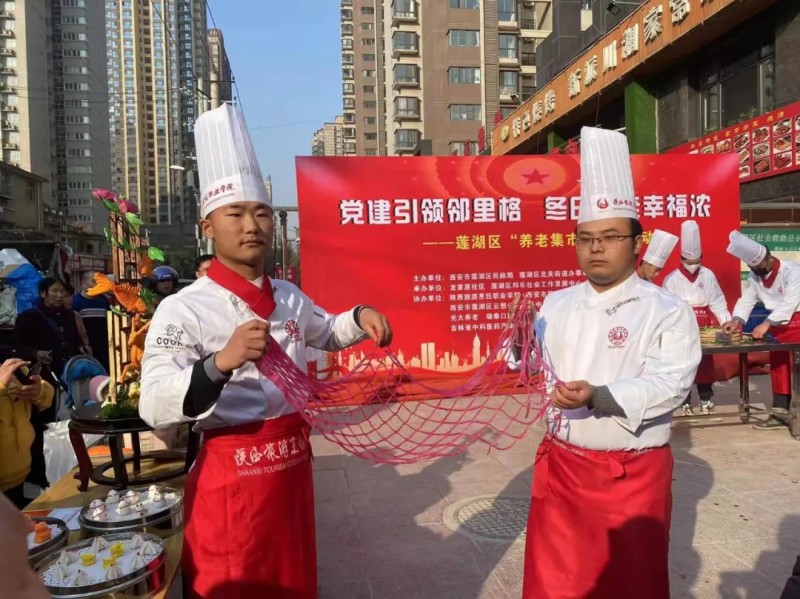 活动中,社区老人一同欣赏了师生们在气球上切黄瓜、菊花豆腐、渔网萝卜、面塑、画盘、雕刻及龙须拉面等专业技能展示,一番操作后,气球完好如初,黄瓜神似蜈蚣,菊花豆腐栩栩如生,龙须拉面细如发丝,频频吸引路人的眼球,现场观众纷纷拍手叫好,民众们也按捺不住,积极参与其中,在接连不断地欢声笑语中感受到了烹饪带来的幸福感和满足感。